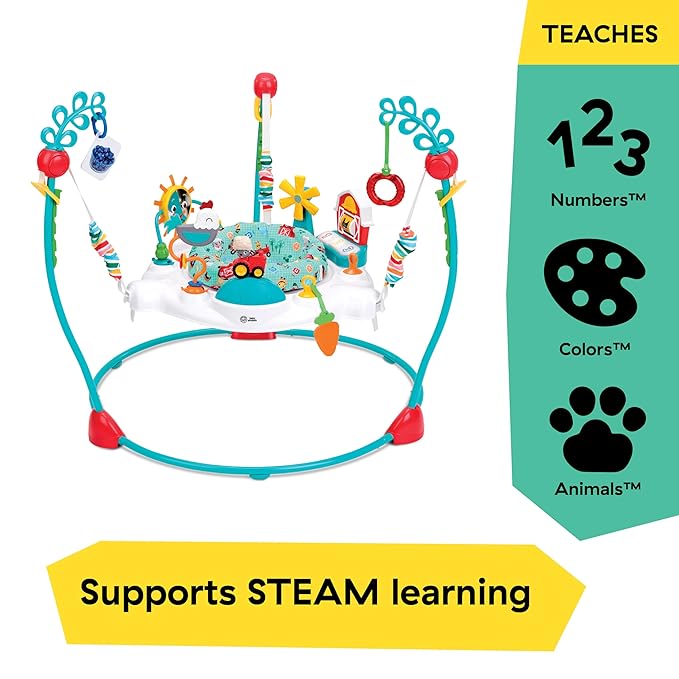 - Engages baby in STEAM-based learning & sensory discovery; build fine & gross motor skills with the interactive jumper & detachable electronic toy