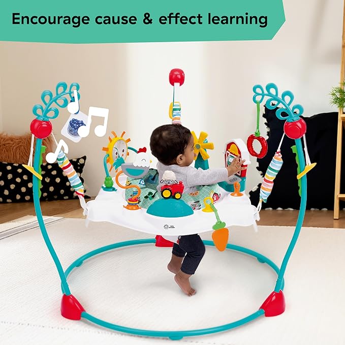 - The Baby Einstein Farm Explorers Jump & Learn Barnyard 2-in-1 Jumper supports baby’s development with 15+ activities and a 360-degree rotating seat
