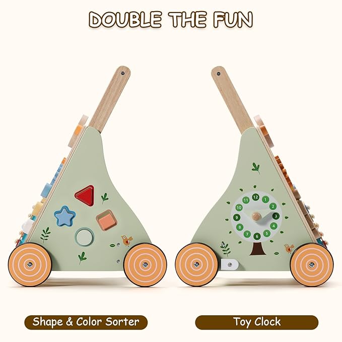 - MULTI-FUNCTIONAL BABY WALKER: The Baby Push Walker comes equipped with many Montessori sensory activity toys, including Interlocking Gears, Shape & Color Sorter, Tree Maze, Mirror, Xylophone, Colorful Beads, Rotating Blocks, Toy Clock, providing a diverse range of play experiences for your baby