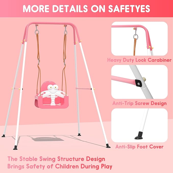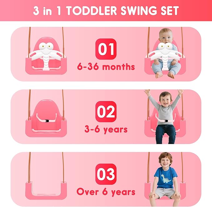 - [3-in-1 Toddler Swing Set] It grows with your child—transitioning from a baby swing with safety belt to a toddler and big kid seat, ideal for indoor nurseries and backyard fun. No more buying separate swings as your little one grows.