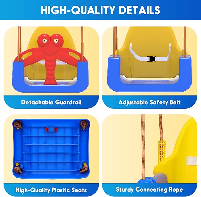- [3-in-1 Toddler Swing Set] It grows with your child—transitioning from a baby swing with safety belt to a toddler and big kid seat, ideal for indoor nurseries and backyard fun. No more buying separate swings as your little one grows.