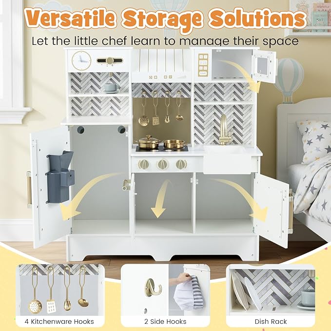 - Smart Storage Options: After the feast is over, the toy kitchen set hides every accessory behind 4 cabinet doors while a dish rack, spice shelf, and 5 hooks keep pots, pans, and play food neatly displayed. Cleanup becomes part of the game, teaching toddlers organization skills and ensuring the pretend coffee station is always ready for the next rush of imaginary customers.