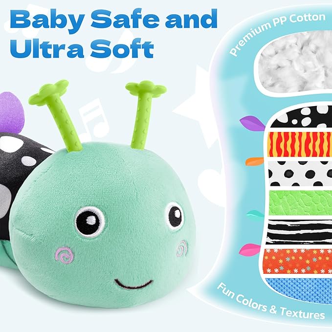 - Every Stage of Baby Growth – HEMRLY baby boy toys features a cute caterpillar head that plays music, and its back includes fun sound elements like a BIBI squeaker and crinkle paper. Babies will reach out to interact with the sounds, helping strengthen head, neck, and arm muscles in preparation for crawling—an ideal developmental baby toys 6–12 months