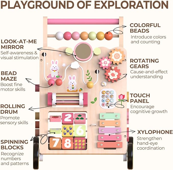 - All-in-One Play & Walk: Features a sensory-rich panel with a mirror, spinning gears, and shape-sorting toys that boost fine motor skills, color recognition, and sensory development. A rear storage rack allows little ones to carry their favorite toys, encouraging emotional comfort and imaginative play on the move
