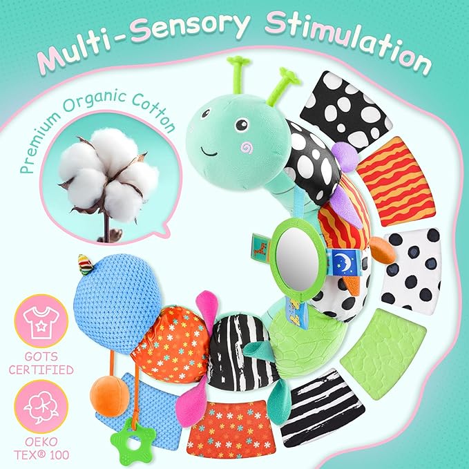 - 【Sensory Toys for Newborns】 The toys for 0-3-6-12 months will engage your baby's senses with built-in crinkle paper, a gentle rattle,a soothing melody, and a soft squeaker. Combined with high-contrast colors and varied textures, this caterpillar stimulates auditory, visual, and tactile development, encouraging curiosity and fine motor skills from 0 to 12 months