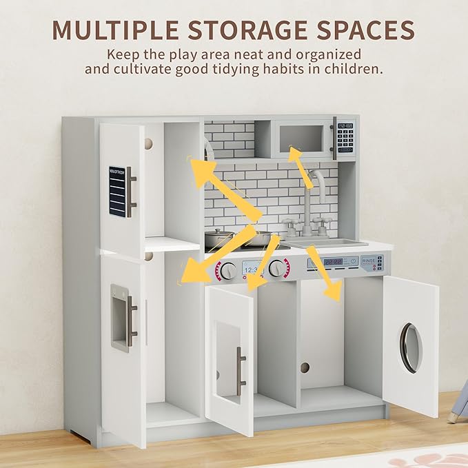 - Spacious Storage & Organized Play: Designed with multiple cabinets and open shelves, this toddler kitchen playset keeps all kitchen accessories neatly stored. Helps develop organization habits and fine motor skills