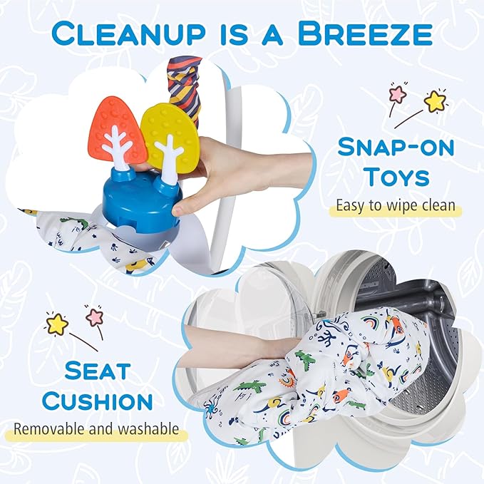 - Cleanup is a Breeze: The snap-on toys are hassle-free to detach and easy to wipe clean. Moreover, the removable seat cushion is washable, so you can maintain a fresh and hygienic play environment effortlessly.
