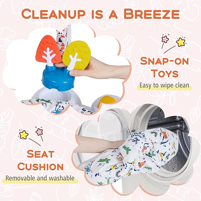 - Cleanup is a Breeze: The snap-on toys are hassle-free to detach and easy to wipe clean. Moreover, the removable seat cushion is washable, so you can maintain a fresh and hygienic play environment effortlessly.