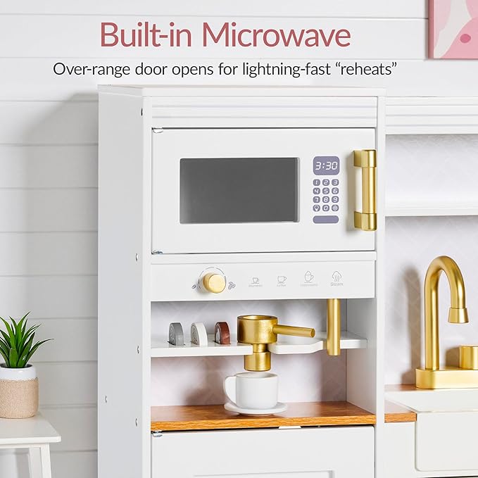 - BUILT-IN MICROWAVE & ESPRESSO MAKER: Interactive features such as a built-in microwave, espresso bar, coffee pods, coffee cup, saucer, and portafilter inspire hours of imaginative fun and role-play
