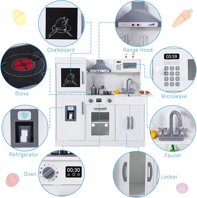 - Lots of Playable Features: The kids kitchen playset opens up a world full of endless possibilities, including an ice maker, range hood, oven, as well as play kitchen accessories and little chef outfits.With a variety of features, children can explore to their heart's content, making this the center for them to unleash their creativity and enjoy fun!